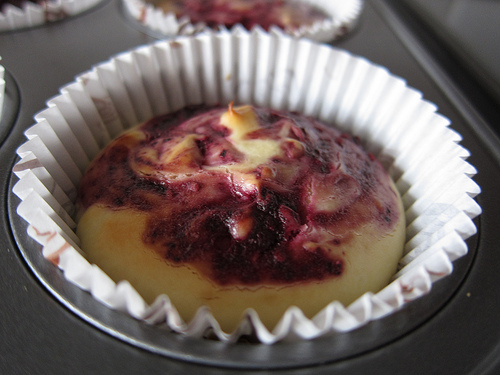 4. Divide the batter among the 13 muffin cups (fill each one almost up to the top). Drop a heaping teaspoon of the raspberry puree in the centre of each cup, pushing it down slightly into each little cake as you go. Using a thin, pointed knife, cut through the batter a few times, just until the raspberry swirls appear (do not mix in the puree completely or the cakes will turn pink and the swirls will disappear).